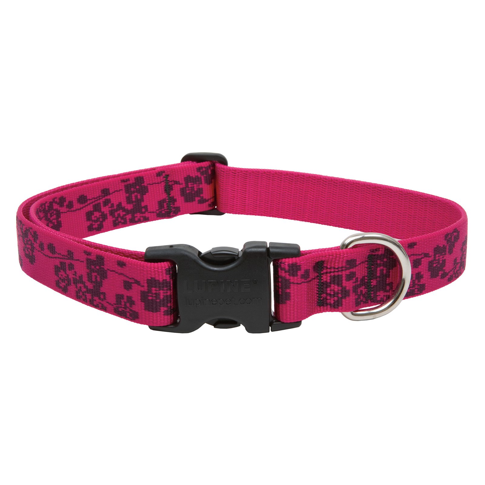 Your canine companion will look adorable in the Lupine Collars and Leads 20252 Adjustable Dog Collar. Featuring a pretty plum blossom design woven into the webbing, it also includes a custom side-release buckle. This nylon dog collar is ideal for medium and large pets and offers adjustability for a comfortable fit.