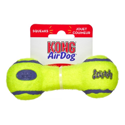 KONG AirDog® Squeaker Dumbbell combines two classic dog toys -the tennis ball and the squeaker – to create the perfect fetch toy. The non-abrasive high-quality material will not wear down dogs’ teeth. Find your dog’s favorite AirDog® shape and let the games begin.
