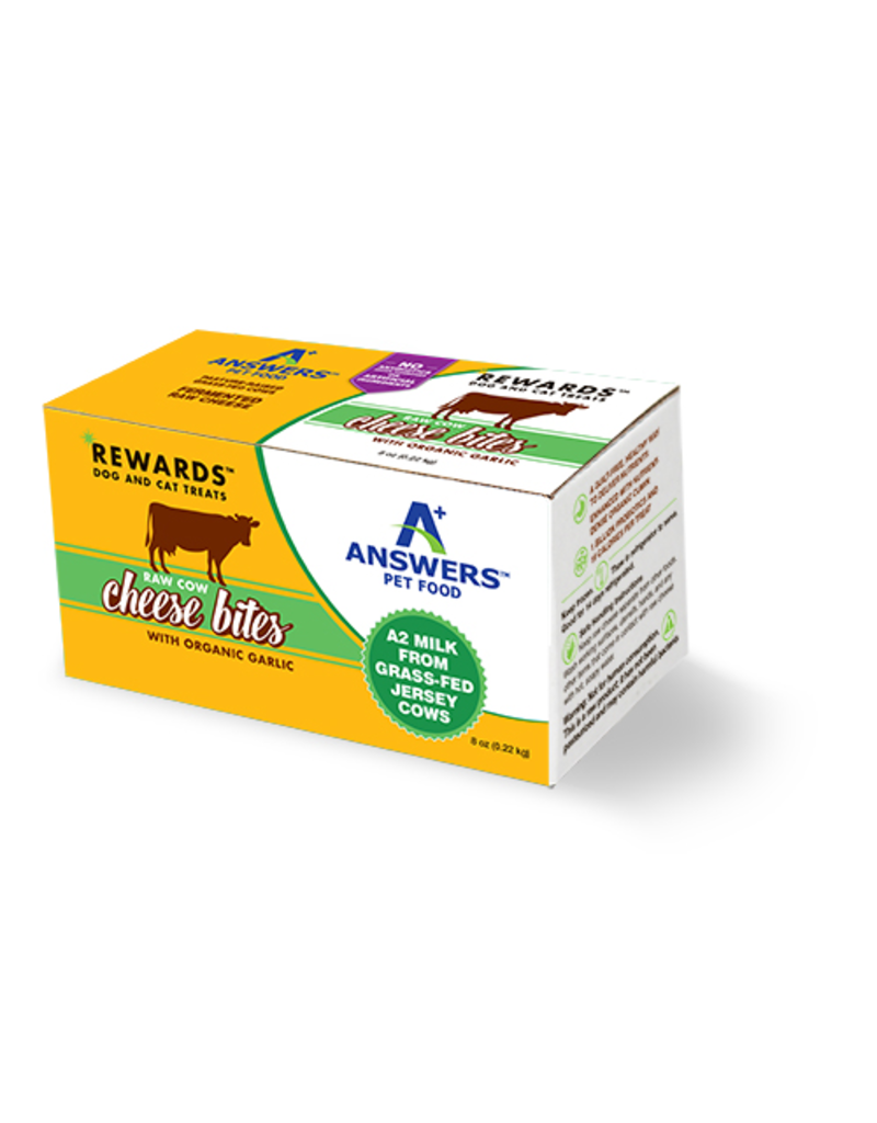 Rewards Raw Cow Cheese Bites treats are made of the milk of Answers pastured, grass fed Jersey cows, who produce A2 milk, which is easier to digest and absorb than other types of milk. From this superlative milk comes superlative healthy cheese, perfect for your pets to enjoy.