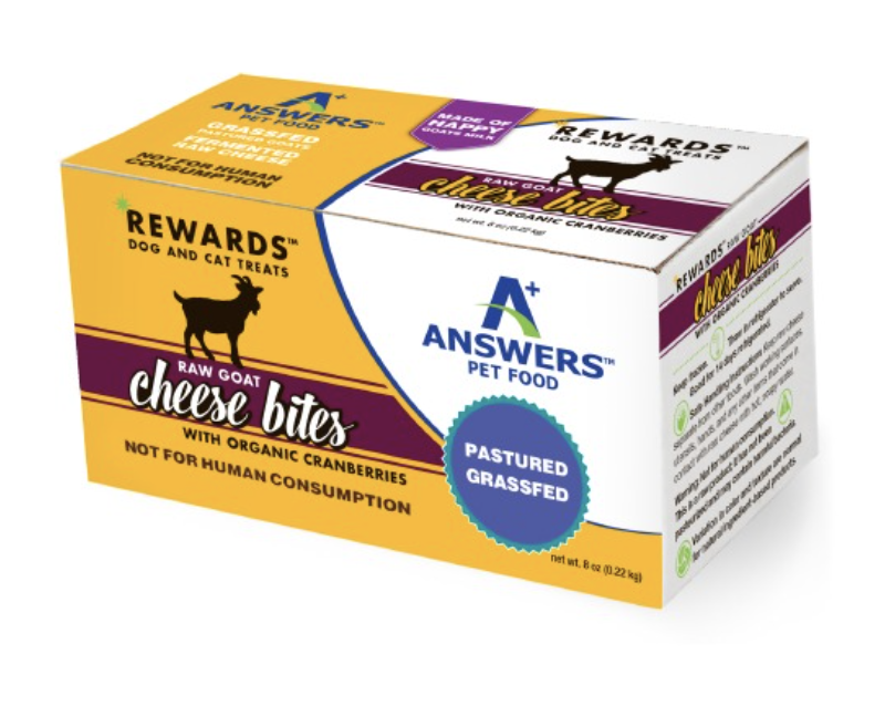 From grassfed goat milk, we’ve created RewardsTM Raw Cheese Bites treat line, enhanced with organic superfoods. Healthy treats teeming with protein, healthy fats and beneficial bacteria are definitely Rewards you won’t feel guilty about giving to your pets. Key Benefits Grass fed goat milk Organic cranberries Healthy fat Great for cats or dogs Easy to digest.