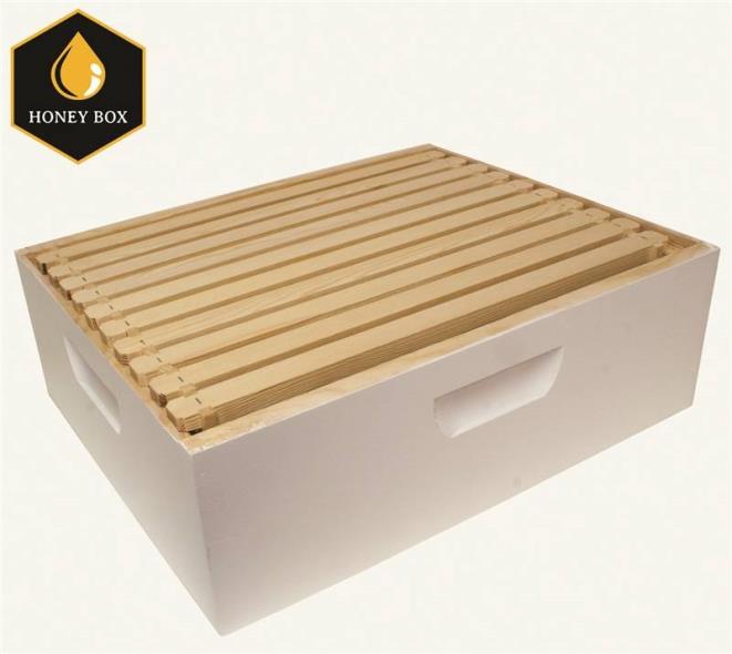Built from Ponderosa Pine and painted with two coats of white exterior latex paint the box is ready to use as brood chambers in your Standard 6 7/8 in 10 Frame Langstroth hive or as honey supers as your hive builds up. Standard use is to continue to add honey supers until you are ready to extract. Based on the standard 10 Frame Langstroth design with handle grips on four sides for easy handling and frame rest lip included. This product is intended for use with Medium Honey 6 to 14 in frames and 5-5/8 in foundations. The plastic foundation has a beeswax coating. Dimension of 16-1/4 x 19-7/8 x 6-7/8 in. No assembly required. It comes fully assembled. Made in USA.