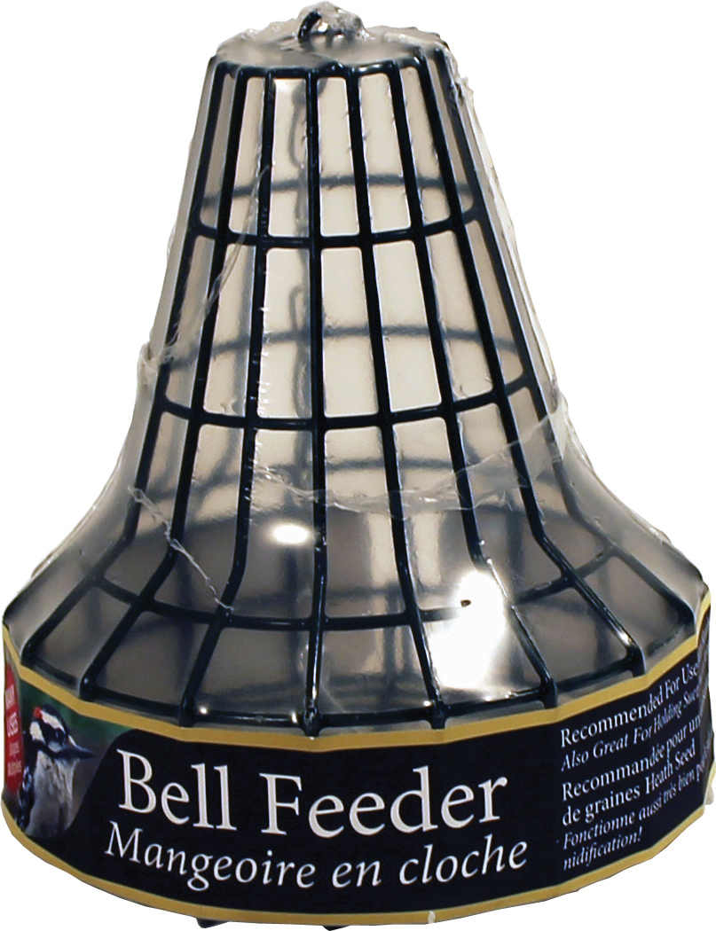 Heath’s Seed Cake Bell feeder is designed to hold 1 seed cake bell. it’s made of weather-resistant vinyl-coated metal and offers plenty of space for birds to feed. The bottom opens for easy filling and the hanging chain is attached.