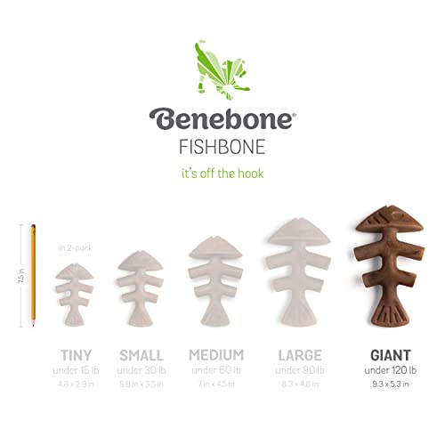 Benebone Fishbone Durable Dog Chew Toy for Aggressive Chewers Real Fish Made in USA Giant Product Details Size: Giant Style: Chew Toy Brand: Benebone EAN: 0810054210320 UPC: 810054210320 MPN: 440250 Language : English Product Dimensions : 9.38 x 1.75 x 8.25 inches; 13.33 ounces Manufacturer recommended age : 1 month and up Item model number : 440250 Date First Available : January 27 2023 Manufacturer : Benebone Country of Origin : USA Best Sellers Rank: #1 355 in Pet Supplies (See Top 100 in Pet Supplies) #32 in Dog Chew Toys #32 in Dog Chew Toys REAL FISH FLAVOR Inspired by the protein of the sea the Fishbone is flavored with real Jack Salmon so your dog will go nuts for the smell of it. The nice thing is you wont notice. DURABLE LONG-LASTING Super chewer? Bring it on. Benebones are tougher than real bones and last for weeks. EASY TO PICK UP AND CHEW The Fishbone is curved for a paw-friendly grip so your pup can quickly grab it and get a good chew going. Think about it: dogs dont have thumbs. USA MADE – We make and source everything in the USA. HAPPINESS GUARANTEED – Have an issue? Want to chat? Reach out to us directly and you ll get a real person whose sole job is to make you and your pup happy. Dogs love to chew especially on stuff that’s got a hint of real fish flavor.The curved fish shape is paw-friendly but challenging at the same time. AboutBenebone At Benebone we started with the premise that dogs experience scentand flavor in a way we can’t even grasp. So we ditched the neon colors andloud squeaks. Inspired by a dog’s powerful sense of smell we developed along-lasting durable chew that’s jam-packed with real fish flavor. Once yourdog takes a bite of our USA-made chews he’ll be hooked. We’re Obsessed withSafety Too Wonder if Benebone is right for your dog? Here’s what you need toknow. Since it’s hard it’s important that your pup has strong teeth. Ifyou’re unsure check with your vet. Nobody likes an unexpected trip to thedentist. Keep an eye out for wear and tear. Within a month or so we find thatmost dogs chew Benebone into submission. See the wear page on our website forhelpful photos to determine when to replace yours. Keep away from householdswith peanut or other allergies. What’s Inside? Nothing but Nylon and Real Fishfor Tantalizing Flavor.