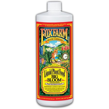 Keep calm and plant on. Spoil your greenery with the health and nutrients they deserve with a 1-ounce bottle of Fox Farm Big Bloom All-Natural/Organic Liquid Plant/Flower Food Concentrate. Suitable for hydroponics soil and drip irrigation systems. Through a carefully selected blend of fertilizers this blossom builder formula supplies nutrients to your plants immediately. Made out of all-natural organic materials such as earthworm castings bat guano Norwegian kelp rock phosphate and more. This plant food enhances nutrient uptake increases yield and helps transfer energy throughout the plant for bigger buds. High PK content sweetens taste fragrance and essential oil production. Enjoy healthy vigorous flowers and upgraded fruit and vegetable flavors. Extend your fruit and flowering season late into the year and bring a struggling root back to life with Farm Big Bloom Liquid Plant Food Concentrate.