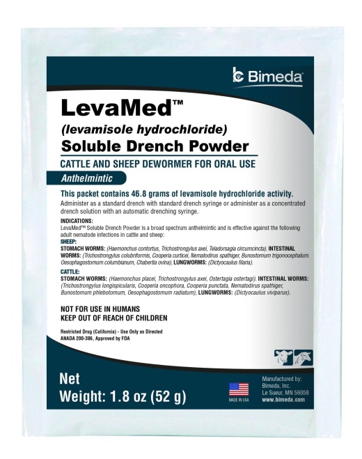 LevaMed Soluble Drench Powder Dewormer, 52 Gram offers a highly effective solution for controlling nematode infections in cattle and sheep. This soluble drench powder is specifically designed for oral use in farm animals, providing convenience and ease of administration. Each 52 gram packet contains a potent 46.8 grams of levamasole hydrochloride activity, ensuring reliable results. Designed to combat a range of adult nematode infections, LevaMed is capable of efficiently addressing intestinal worms, lungworms, and stomach worms in both cattle and sheep. Its powerful formulation ensures a thorough and comprehensive treatment, promoting the overall health and well-being of your animals. This dewormer is manufactured in the USA to meet the highest quality standards. With its proven efficacy and reliable performance, LevaMed offers a viable alternative to the popular Prohibit Soluble product. However, it is important to note that LevaMed Soluble Drench Powder Dewormer is not labeled for use in goats. Safety is paramount, and it is essential to follow the recommended guidelines when using this product. LevaMed should not be used in humans, and it is crucial to keep it out of the reach of children to prevent accidental ingestion. By adhering to these precautions, you can ensure the well-being of both your animals and your family. Invest in the welfare of your cattle and sheep with LevaMed Soluble Drench Powder Dewormer, a trusted solution for nematode infections. Enhance their overall health, minimize the risk of infestations, and promote optimal productivity. Place your order today and experience the benefits of this reliable and effective deworming solution.