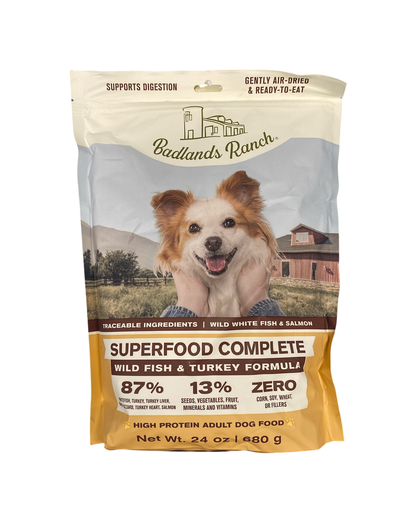 Superfood Complete Wild Fish & Turkey Formula is packed with some of the most wholesome and beneficial foods on Earth, featuring premium whitefish and turkey, nutrient-dense organs, heart-healthy salmon, and a variety of gut-healthy vegetables and fruits. This premium blend delivers all of the nutrients your dog needs to enjoy smooth digestion and overall wellness. These carefully selected ingredients are cooked responsibly at low temperatures to deliver maximum nutrition with every bite. Superfood Complete contains no corn, soy, wheat, or fillers — it’s all the good stuff your dog needs to thrive, with none of the bad.