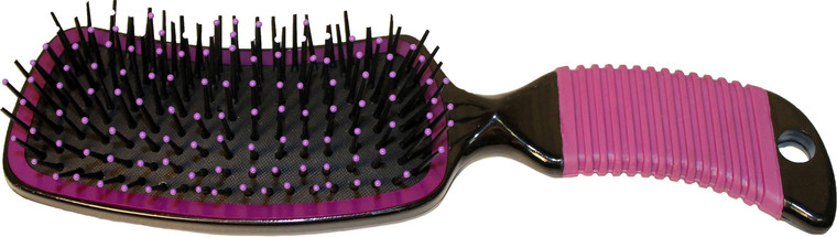 Curved handle with rubber grip. Soft plastic bristles perfect for brushing tails and manes.