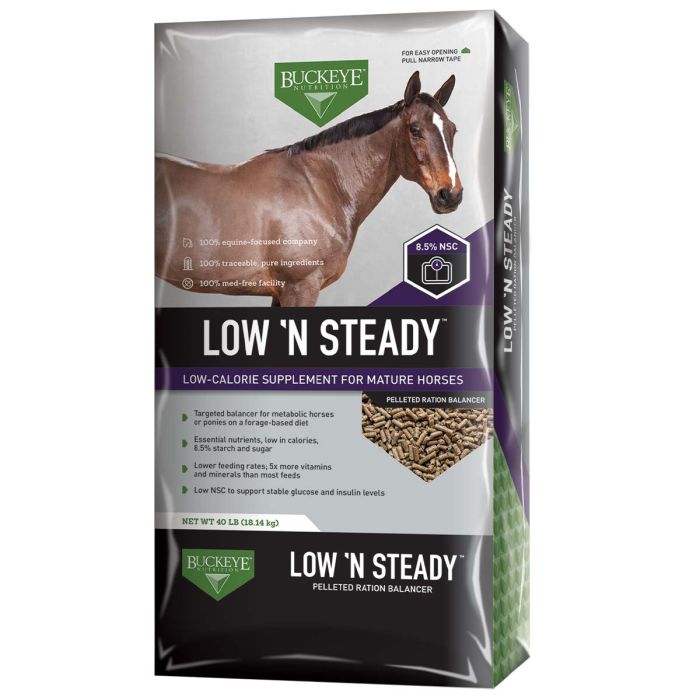 Buckeye Nutrition Low ‘N Steady Ration Balancer is a low-calorie supplement designed for mature horses. It provides essential nutrients with a focus on supporting metabolic horses or ponies on forage-based diets. With only 8.5% starch and sugar, it helps maintain stable glucose and insulin levels. Lower feeding rates deliver five times more vitamins and minerals than most feeds. Product Details:. Essential nutrients, low in calories, 8.5% starch and sugar. Low NSC to support stable glucose and insulin levels. Low-calorie supplement for mature horses. 24 percent protein.