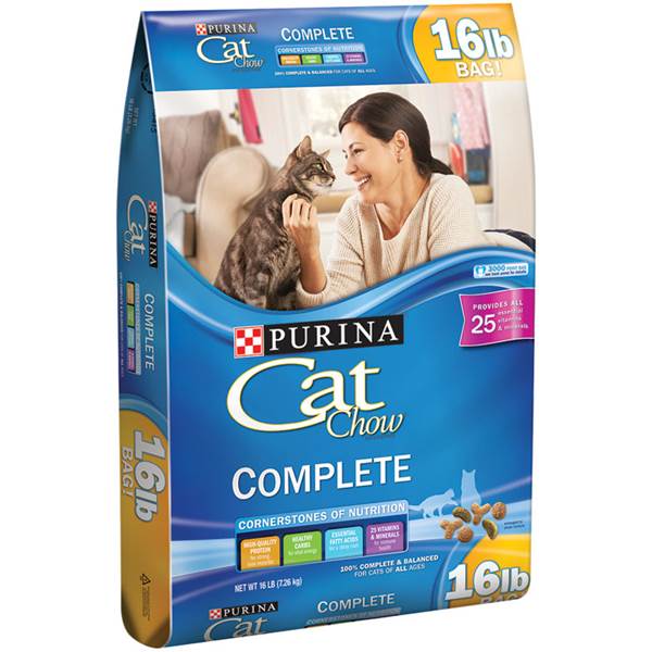 Purina Cat Chow Complete Dry Cat Food Whole Grain This Purina cat food recipe is made with real and farm-raised chicken and supplies high-quality protein to support strong muscles. Plus it has healthy carbs for vital energy and omega-6 fatty acids to help promote a shiny coat. Purina Cat Chow Complete is formulated to nourish cats at every stage of life from kittens to adult cats providing them with 25 essential vitamins and minerals to support overall health. Wholesome ingredients give you confidence that your cat is getting a quality meal in her cat dry food dish and 100 percent complete and balanced nutrition helps to support her overall health and wellness. Give your cat the four cornerstones of nutrition at every feeding including high-quality protein healthy carbs essential fatty acids.