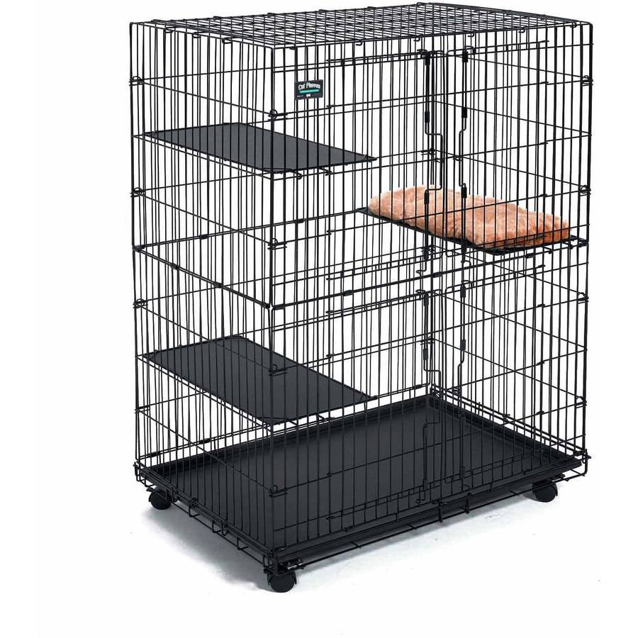 Give your furry friend a safe and comfortable place to play with this Midwest Collapsible Cat Playpen. This enclosure helps to keep your pet secure both indoors and out. The Midwest cat playpen is designed not only with your feline s health in mind but also to make your life easier. Other features include a slide-out leak-proof plastic floor pan and swing-open front doors with dual-point latches. This cat playpen model 130 is roomy enough for small kittens to large cats while still offering ample space to play whether it be on the plastic pan or jumping from one of three adjustable wire-framed plastic resting benches. When your cat wants to rest there s also a comfortable deluxe chenille cat bed where they can curl up and take a nap. This Midwest collapsible cat playpen will help ensure your cat s safety.