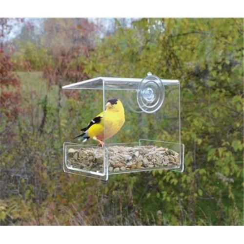 Up close and personal bird watching! Great for introducing children to birding! Open tray holds 1 cup of seed. Covered roof provides all-weather feeding. Constructed of heavy, clear acrylic. 1 suction cup attaches securely to window.Dimesnions:Depth:5Width:5.25Length:3.5.