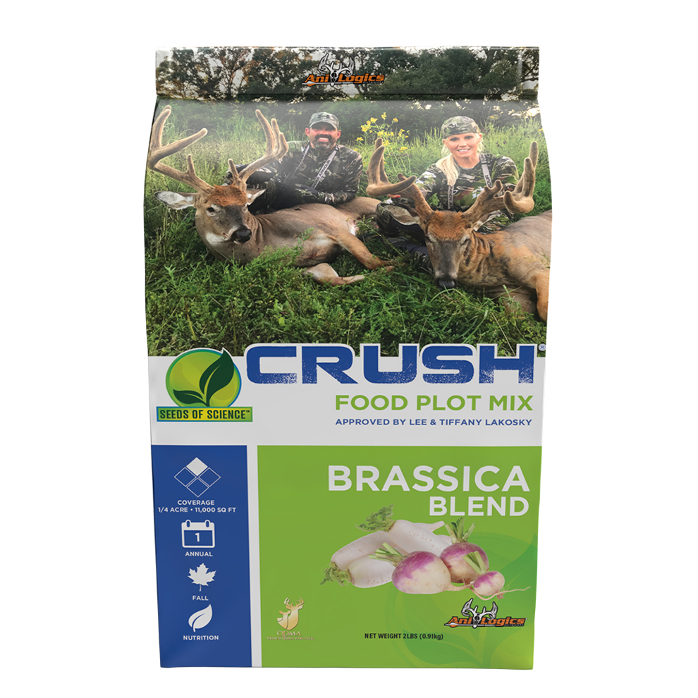 Brassicas make the best fall kill plots! So planting Ani-Logics Outdoors CRUSH Seeds of Science Pro Brassica Blend Deer Food Plot Mix for late season whitetail attraction is a no-brainer. We combined Lee and Tiffany Lakosky’s most trusted and preferred brassica varieties to create the ultimate brassica food plot blend. This advanced scientific kill plot blend uses six of Lakosky’s favorite brassicas including premium New Zealand brassicas collards turnips rape and radishes to attract and grow trophy bucks. The diverse range of brassicas gives your deer herd delicious options for their late season munching providing deer an irresistible field of sweet treats. Use this killer attraction to your advantage by planting near your hunting blind or stand. Plant in the fall for a quick growing easily established food plot that maximizes tonnage and protein levels while enduring extreme temperatures defying nature and staying green to temps reaching a chilling 10 degrees F. Experience the late season deer attraction power for yourself. It’s a real showstopper!