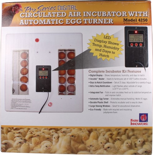 DIGITAL PRO SERIES INCUBATOR WHITE Circulated air incubator with automatic egg turner LED display shows temperature humidity and days to hatch Features durable plastic shell and large viewing windows Made with recycled and insulating polystyrene foam.