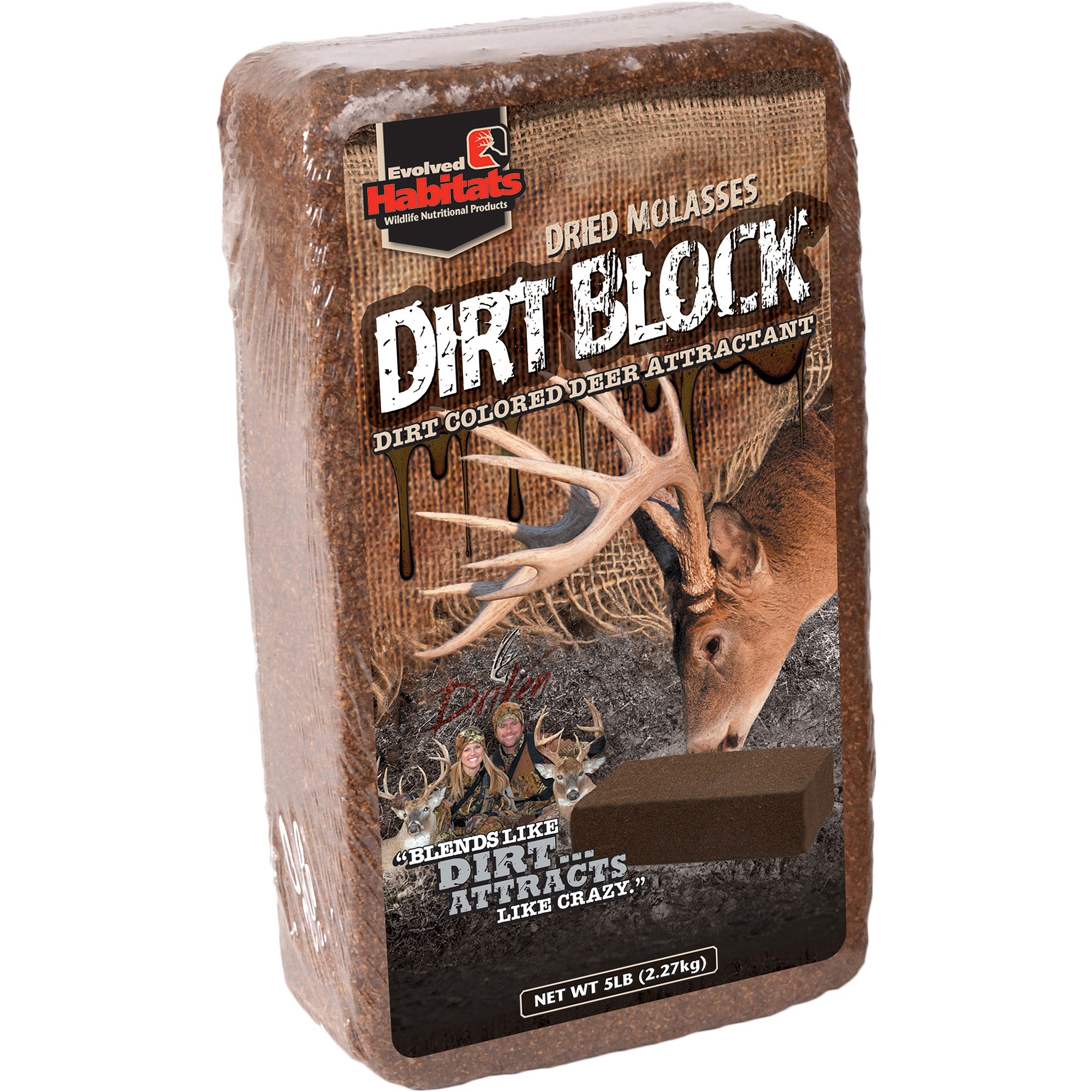 Looks like dirt.. attracts like crazy! Dirt Block is a deer attractant made from dried molasses with high amounts of protein and fat. They ll love the molasses taste and you ll love the rack building results. Best of all Dirt Block looks like dirt so it won t give away your favorite hunting spot.