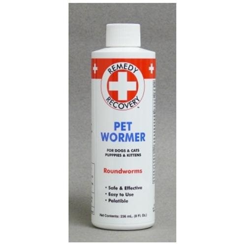 Remedy+Recovery Pet Wormer Remedy+Recovery Pet wormer is a safe and effective way to removed roundworms from your pet s system. This palatible liquid is easy to use. Simply add it to your pet s food or drinking water. Use it to treat these types of large roundworms: Toxocara canis Toxocara cati and Tocascaris leonina. Features: Removes roundworms Safe and Effective Easy to use Palatible Add to food or drinking water Item Specifications: Size: 8oz Active Ingredients: Piperazine Citrate 275 mg/tsp Inactive Ingredients: Water Sucrose Sodium Saccharin Carmel Citric Acid Methylparaben Propylparaben Artificial Flavor.