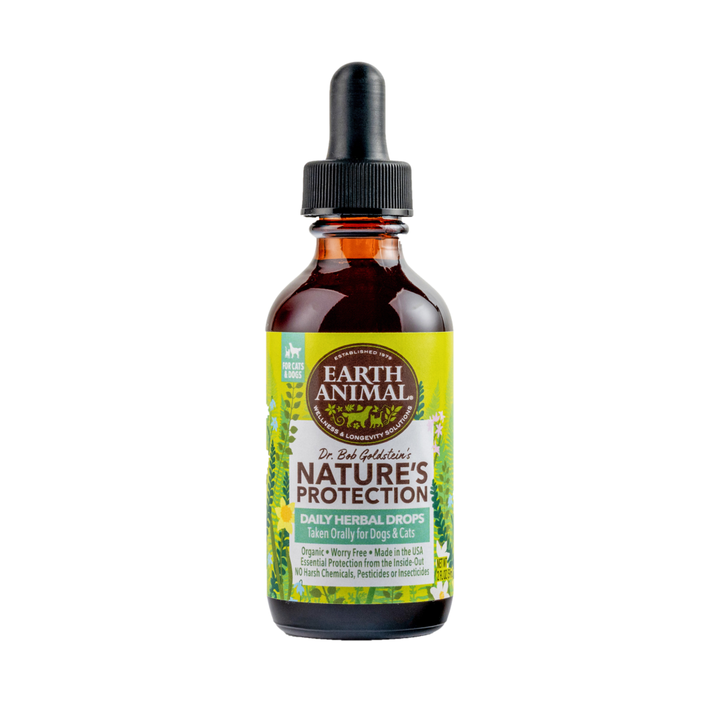 Earth Animal’s Nature’s Protection Flea & Tick Daily Herbal Drops is a highly absorbable blend that helps boost immunity and guard both dogs and cats from fleas and ticks during times of increased exposure. The combination of these carefully selected herbs boost the body’s defense and quiets the allergic reaction and itching from bites. Pesticide-Free. Nutrients, vitamins, and minerals that support and protect, without chemicals. Veterinary Formulated. Developed by Dr. Bob Goldstein, VMD, drawing on 40+ years of experience in holistic, integrative medicine. Made in the USA.