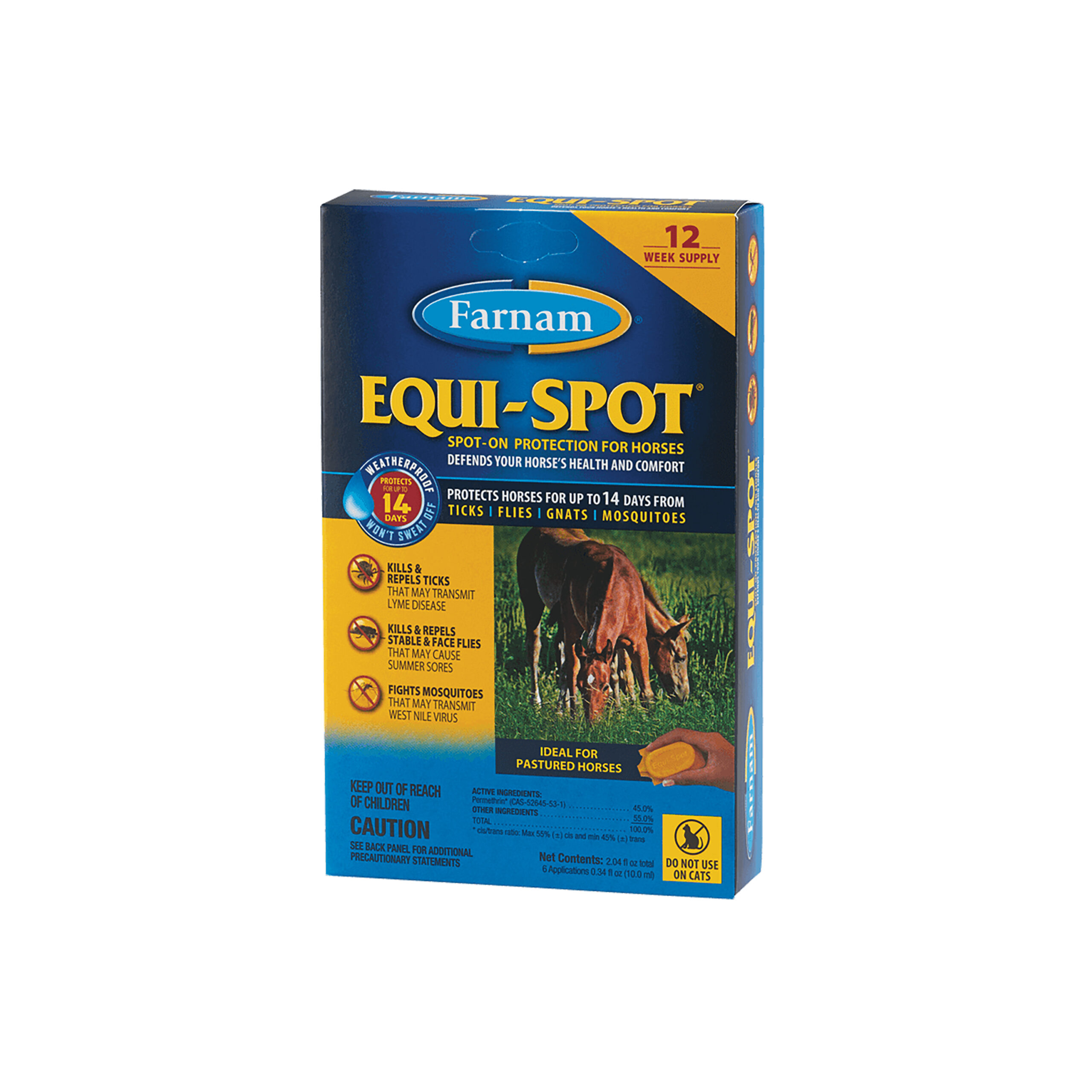 No mercy for ticks and more! Farnam knows that horse fly control tick control and insect control for your pastured horses can be a challenge we get you and we got your back! Equi-Spot Spot-On Fly Control for Horses is Farnam s best choice for pastured horses that are not able to be regularly sprayed with a horse fly repellent spray including mares and foals. Here s how it works! Just one easy application of Equi-Spot every two weeks lasts up to two weeks (that s right protection lasts for up to 14 days!) Equi-Spot delivers long-lasting protection against biting flies bloodsucking gnats dangerous ticks that can carry Lyme disease mosquitoes that may transmit West Nile Virus and flies that may cause Summer Sores. That s a lot of protection and peace of mind for you and your horses! Equi-Spot fly tick and mosquito protection won t wash off in the rain or when your horse sweats. Choose between a 6-week supply (green box with 3 applications) or a 12-week supply (blue box with 6 applications). Bugs don t fly with Farnam your partner in horse care.