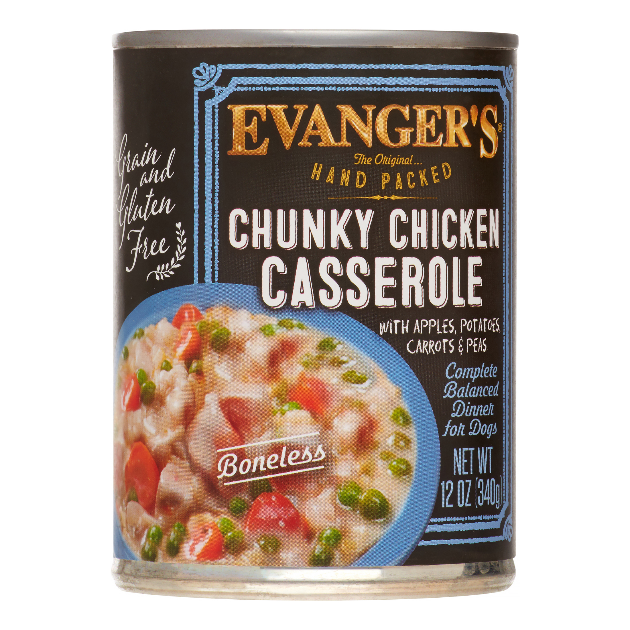 Evangers Chunky Chicken Casserole is formulated to meet the nutritional levels established by the AAFCO nutrient profiles for all life stages. Puppies pregnant and nursing dogs may require 2-3 times above amounts and reduced for less active or older dogs. Amount of food your dog requires depends on activity age environment and breed. Ingredients:Chicken Chicken Broth Carrots Peas Potatoes Guar Gum Minerals (Calcium Carbonate Zinc Sulfate Ferrous Sulfate Zinc Proteinate Copper Sulfate Manganese Sulfate Copper Proteinate Sodium Selenite Manganese Proteinate Potassium Iodide) Vitamins (Vitamin E Supplement Niacin L-Ascorbyl-2-Polyphosphate Thiamine Mononitrate Calcium Pantothenate Vitamin A Acetate Folic Acid Riboflavin Biotin Pyridoxine Hydrochloride Vitamin B12 Supplement Vitamin D3 Supplement).