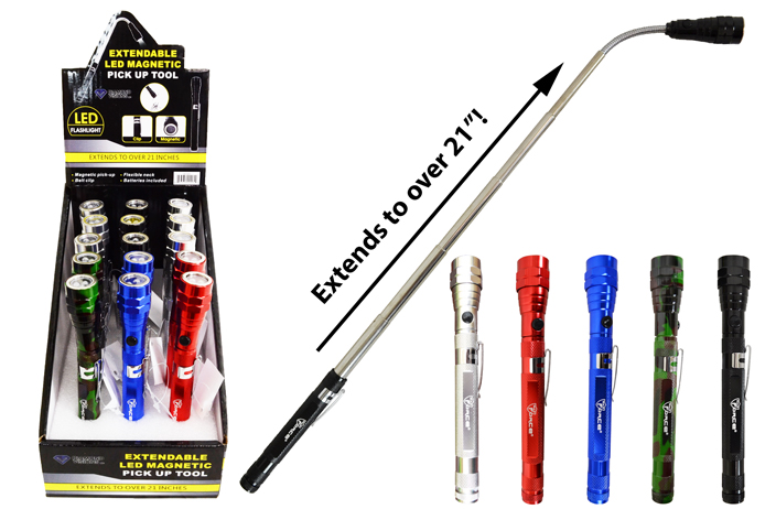 See behind tight spaces and pick up items in hard-to-reach places with this 2-in-1 Aluminum Flashlight from Diamond Visions! The flashlight features a telescopic frame with a magnetic head and functions as a magnetic pick up tool! The flashlight measures just 7 inches long, but extends up to 27 inches in length. Batteries included. Pack of 15.