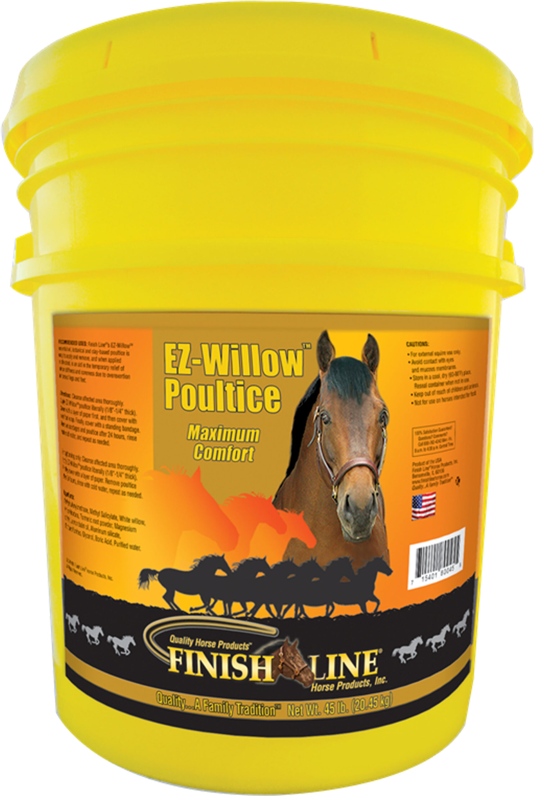 NEW from Finish Line! EZ-WillowTM Poultice is a botanical and clay based poultice for maximum comfort on your horses’ legs. Easy-on and easy-off application. Washes off hands easily with warm water. Contains: Methylsulfonylmethane, Methyl Salicylate, White Willow, Arnica Montana, Turmeric Root Powder, Magnesium Sulfate, Lemon Balm Oil, Water, Aluminum Silicate, Montmorillonites, Glycerol, Boric Acid, Purified Water.
