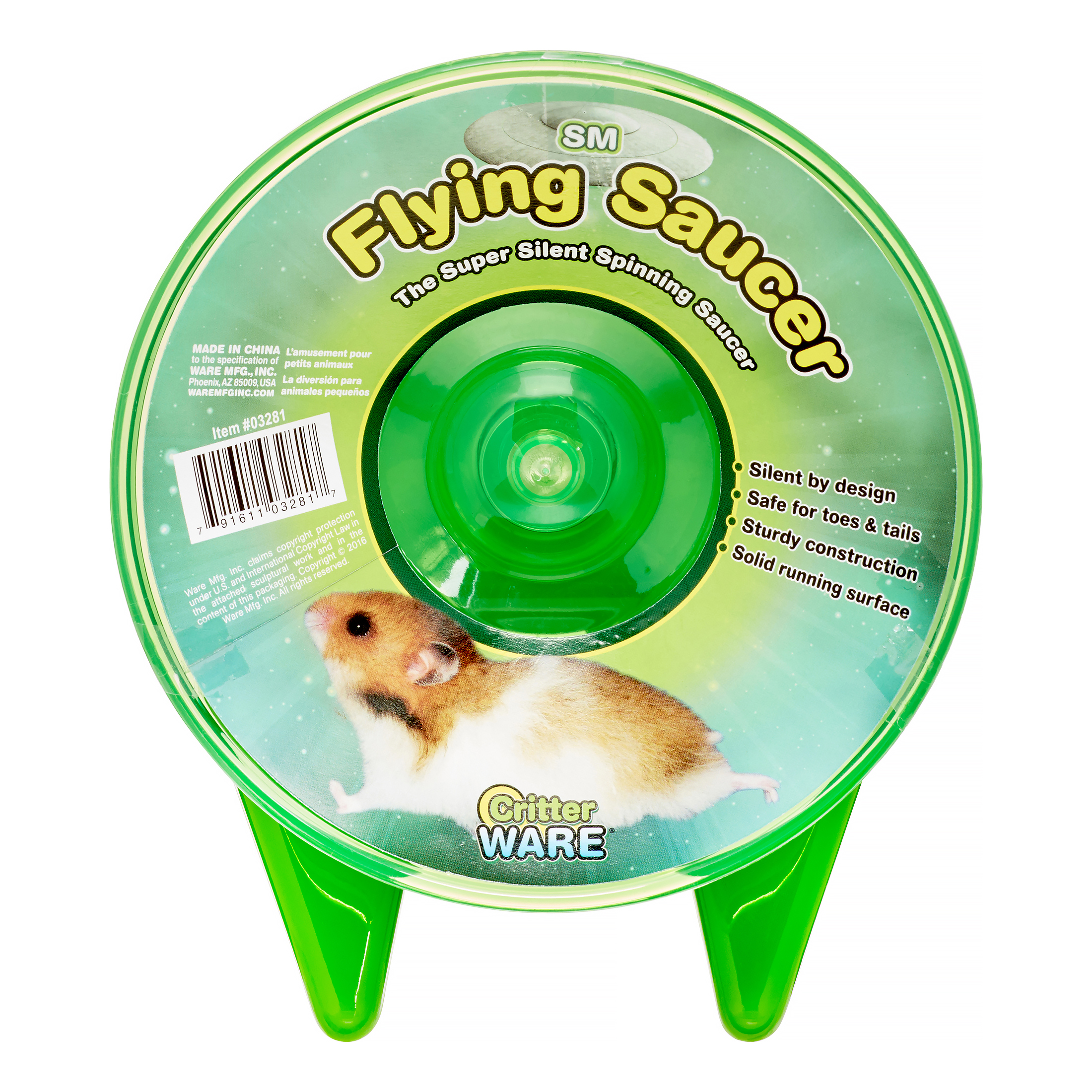 Since 1983 Ware Manufacturing has been making award-winning innovative products for pets. Give your little furry friend an outer space-themed place to run with the Ware Flying Saucer Small. This safe exercise wheel has as a solid running surface and a quiet smooth-turning acetyl plastic hub.
