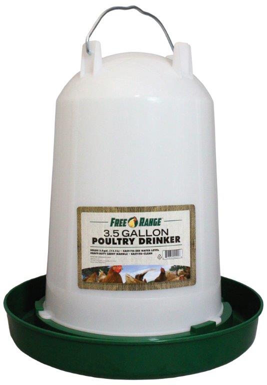 Molded from long-life plastic with durable fountain. Easy-to-fill and easy-to-clean drinker features a twist-lock system and hanger/carry-handle. Accommodates up to 56 chickens or game birds.