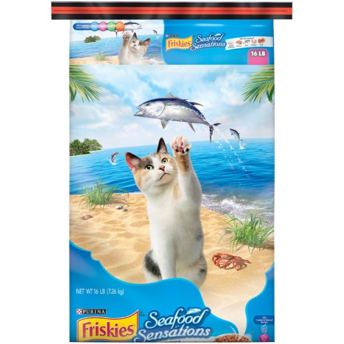Friskies Seafood Sensations Salmon & Tuna Dry Cat Food Take your cat s mealtime excitement to a whole new level when you pour her a dish of Purina Friskies Seafood Sensations dry cat food. Salmon tuna and shrimp flavors combine to create a taste she ll love and a touch of seaweed flavor balances out the recipe for delicious goodness. Essential vitamins and minerals in every serving let you feel good about offering this dry cat food to your feline friend and essential fatty acids help support her healthy skin and coat. Each serving contains 100 percent complete and balanced nutrition for every stage of life so your cat can enjoy this scrumptious recipe from her playful kitten days all the way through her adventurous adult years.