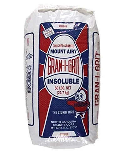 Gran-I-Grit Grower Grit is a feeding grit that enables poultry to process hard to digest items such as feed shavings feathers and other fibrous items. Poultry will used the crushed stone to grind feed in the crawl as it continues down the digestive tract. Continuous feeding of Gran-I-Grit can prevent digestive disturbances diarrhea cannibalism cropbound conditions and certain forms of paralysis.