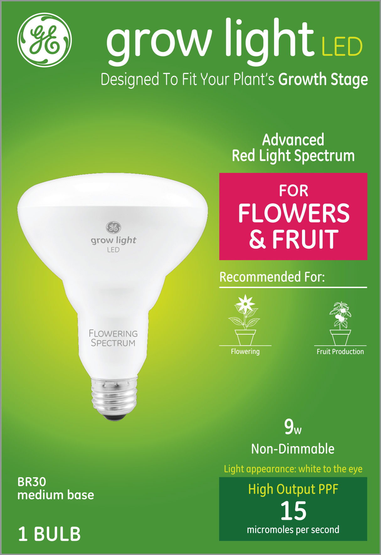 GE LED Grow Light for Indoor Plants with advanced red-light spectrum for flowers and fruit is designed to fit your plant s growth stage. Grow Light uses an advanced red-light spectrum that allows plant pigments to optimize their light harvesting and inspired by best practices used by professional growers. It is designed for mature plants at the fruiting or flowering growth stage. Compared to typical purple grow lights the light features high PPF – photosynthetic photon flux to provide more light for photosynthesis and growth. The white light appears more natural to the human eye so you can appreciate your plant s beauty and spot pests or discolorations to help keep your plants healthy. Use the advanced red-light spectrum with high light plants like tomatoes cucumbers and peppers at the fruiting or flowering stage of growth.
