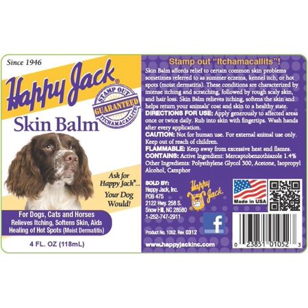 Happy Jack® Skin Balm affords relief to certain common skin problems sometimes referred to as summer eczema kennel itch or hot spots (moist dermatitis). These conditions are characterized by intense itching and scratching followed by rough scaly skin and hair loss. More suitable for indoor use because of its non-staining pleasant smelling formula. Skin Balm is recommended for rough dry scaly skin loss of hair and intense itching. In advanced stages skin appears like elephant hide. Skin balm softens the skin relieves itching and helps return your animal s coat and skin to a healthy state. If your dog or cat is constantly itching scratching and gnawing Skin Balm will bring fast relief as it gently soothes and aids healing to irritated areas. For Dogs Cats & Horses.