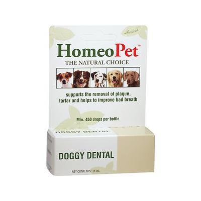HomeoPet Doggy Dental A natural homeopathic remedy for dogs that aids in the removal of plaque and tartar. Supports healthy teeth gums and breath. Can help reduce bad breath discoloration of teeth swollen gums and trouble chewing. Made in the USA. Minimum of 450 drops per bottle. Features & Benefits: fast-acting liquid natural medicine form nature no harsh chemicals no known side effects may be used for puppies may be used for senior pets can be safely used long term great value with up to 90 doses easy to dose liquid Directions for use: Add to clean water twice a day. May also be given directly in the mouth or with meal. Dosage: less that 1 lb – 2 drops in 8 oz water 21-60 – 5 drops 61-100 – 10 drops over 100 lb – 20 drops.