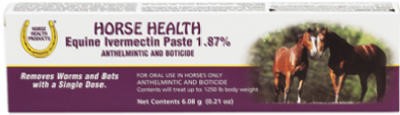 Horse Health (Ivermectin Paste 1.87%) PLEASE NOTE: THIS PRODUCT IS NOT INTENDED FOR HUMAN CONSUMPTION. This apple-flavored Ivermectin Paste Dewormer provides effective treatment and control of most parasites in horses, removing worms and bots in a single dose. It is effective on large and small strongyles, pinworms, ascarids, hairworms, large-mouth stomach worms, bots, lungworms, intestinal threadworms, and summer sores caused by Habronema and Draschia spp. cutaneous third-stage larvae. Features: Kills 35 species and stages of worms and bots combined Kills all three stages of the two most common bot species Use every other month (six times per year) for broad spectrum parasite control One syringe treats a 1,250-pound horse Safe and effective on all horses including broodmares, stallions, and foals No need to rotate with another wormer Made in the USA Item Specifications: Size: 1 tube of Horse Health 1.87% Ivermectin; may come in cellophane wrap or in box. Active Ingredient: 1.87% Ivermectin Note: This item is not available in Canada. For additional product information, please see clickable links listed under Downloadable Resources.