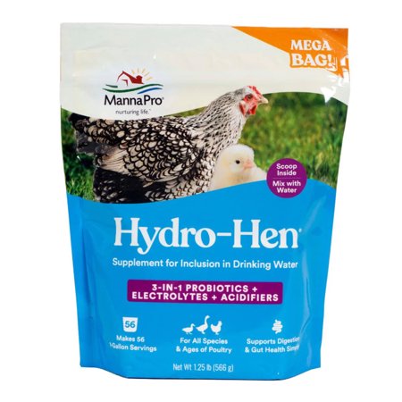 Chicken Water Supplement with Electrolytes Everything they need in one scoop. Hydro-Hen contains probiotics electrolytes and acidifiers to provide hydration and gut health when your birds need it most. Designed for inclusion in the drinking water of all species and ages of poultry (chickens ducks turkeys geese and other domestic poultry and waterfowl) it provides important nutrients and probiotics to support digestive health and hydration. Makes 22 one-gallon servings For all species and ages of poultry Simply mix with water Hydro-Hen is a great addition to your poultry first aid kit Supports digestion and gut health.