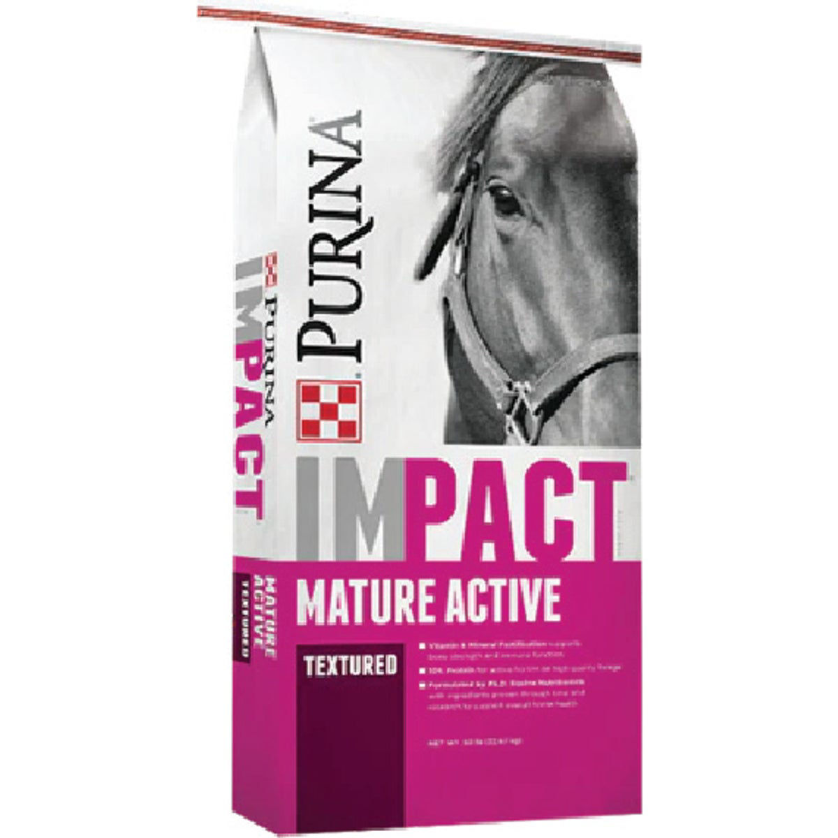ACTIVE HORSES NEED MORE THAN FORAGE. Support your horses active lifestyle with IMPACT MATURE ACTIVE Horse Feed. Formulated with premium nutrition which provides the necessary calories and nutrients for mature horses at maintenance through moderate activity. With over 100 years of expertise and research in equine nutrition and a dedicated team of Ph.D. Equine Nutritionists and Equine Veterinarians, nobody knows more about horse nutrition than Purina. Purina IMPACT is formulated to deliver premium nutrition with only high-quality ingredients that have been proven through years of feedings to support overall horse health and performance.See the difference IMPACT feed can make for your horses. For active horses on high quality forage Added fat from vegetable oils for sustainable energy and a shiny hair coat Meets your horse’s nutrient requirements when fed as directed Offered in Textured or Pelleted Form Highly digestible and naturally palatable Supports bone strength and immune and reproductive function. Product manuals and information Buying Guides. Related Product Articles. Request Safety Data Sheet (SDS).