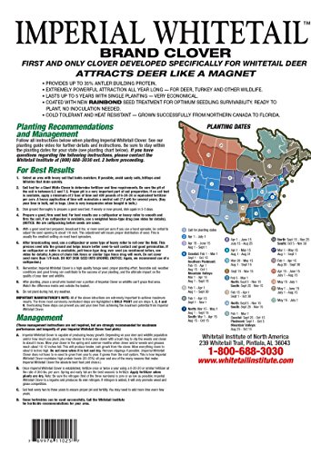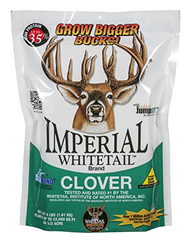 Imperial Whitetail Clover is a professionally formulated blend of high yielding clover varieties that offers very unique traits when compared to traditional plantings for wildlife. Wildlife biologists now know the critical importance of high-quality forage and browse for whitetails year-round especially during the spring and summer months of antler growth and fawn development. Without high-quality high-protein browse during the antler-growth season a buck s antlers will not reach their genetic potential. Produces up to 30 – 35% protein 12 months a year and can last for up to 5 years without replanting saving you time and money!
