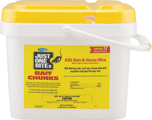 Just One Bite II Bait Chunks . For indoor and outdoor rat and house mouse control; Bait chunks fit in burrows, runways and hard-to-reach areas where rats and house mice live and breed; Features nibble ridges to promote rat and house mouse chewing; The hole through the middle allows for mounting in bait stations; . Directions for Use . APPLICATION DIRECTIONS: Each Just One Bite II Bait Chunk weighs 2-oz. RATS: While wearing gloves, apply two to eight 2-oz. blocks at each placement location in infested areas. For burrow applications, insert one to two 2-oz. pieces of block at least six inches into each active burrow. Check treated burrows each morning and evening to make sure that baits have not been pushed out of burrows. For above ground treatment, space bait placements 15 to 30 feet apart. Maintain an uninterrupted supply of fresh bait for 10 days or until fresh signs of rat activity cease to appear. MICE: While wearing gloves, apply one 2-oz. chunk per placement in infested areas. Space placements at 8 to 12 foot intervals. Maintain an uninterrupted supple of fresh bait for 15 days or until fresh signs of mouse activity cease to appear. . FOLLOW-UP: Replace contaminated or spoiled bait immediately. Wearing gloves, collect and dispose of all dead animals and leftover bait properly. To prevent reinfestation, eliminate food, water, and harborage as much as possible. If reinfestation does occur, repeat treatment. Where a continuous source of infestation is present, establish permanent bait stations and replenish bait as needed. .