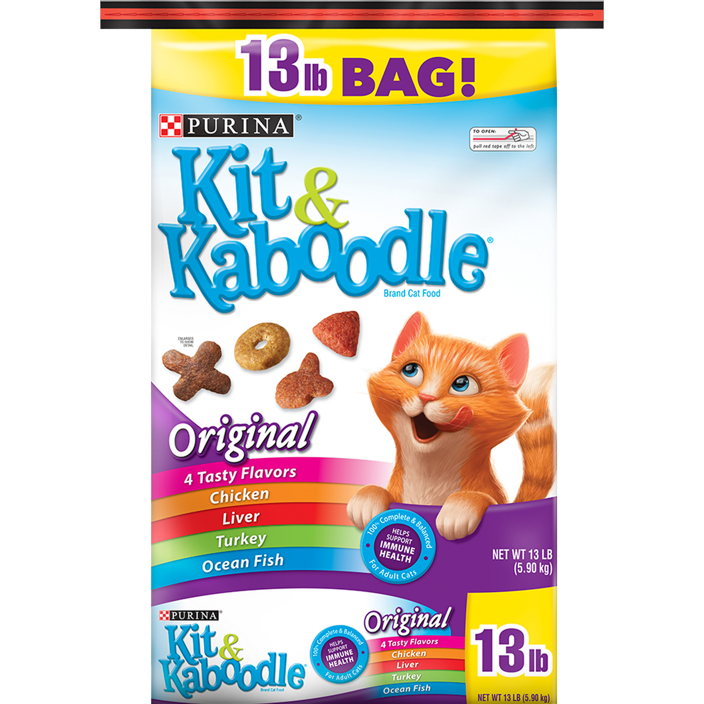 Surprise your cat with a nutritious bowl of flavorful fun every time you serve them Purina Kit and Kaboodle Original Poultry Liver and Ocean Fish Flavors cat kibble. With no room for bowl boredom Purina dry cat food blend offers a variety of fun crunchy shapes four to be exact to couple with its cat-thrilling combination of palate-pleasing goodness. Each Kit and Kaboodle dry cat food kibble shape represents a flavor poultry liver or ocean fish creating a blend of tastes any cat would go crazy over. The texture of this crunchy cat food dry kibble helps support clean teeth while the essential vitamins and minerals in every serving help promote overall health. Feel confident knowing you are giving your furry friend the daily 100 complete and balanced nutrition for adult cats she needs while also making mealtime an engaging experience when you supply her with this adult cat dry food. It really is the whole kit and kaboodle. And get peace of mind knowing that each Purina cat food is crafted in Purina-owned facilities and meets the industry standards for quality and safety. Stop the comparison shopping; when you order Kit and Kaboodle Original you re providing your pet with a Purina cat food that s backed by over 90 years of research and innovation from a brand you can trust.
