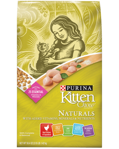Purina Kitten Chow Naturals is formulated to meet the nutritional levels established by the AAFCO Cat Food Nutrient Profiles for all life stages. Help your kitten get the wholesome nutrition she needs to get a great start in life with Purina Kitten Chow Naturals With Added Vitamins Minerals and Nutrients dry cat food. Containing essential nutrients like those found in mother s milk this recipe is made with high-quality natural ingredients plus all 25 essential vitamins and minerals to help her grow up strong. Real chicken is the number 1 ingredient. High protein helps support your kitty s developing muscles and DHA helps promote her brain and vision development. Cats adore the great taste of Purina Kitten Chow Naturals which contains no artificial colors flavors or preservatives. You can also appreciate a recipe that provides 100 percent complete and balanced nutrition for kittens. After one year of age begin introducing her to Purina Cat Chow Naturals Original With Real Chicken and Salmon featuring omega 6 to promote her healthy skin and coat. Grow with Naturals At 12 months it s time to start switching your kitten to adult food. Check out the full line of Cat Chow Naturals formulas to find the right one for your cat. Real Chicken is the #1 Ingredient.