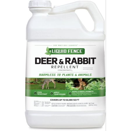 Liquid Fence Deer & Rabbit Repellent Concentrate repels deer and rabbits before they feed! This concentrated liquid formula repels deer and rabbits from landscaped ornamental gardens, flowers, shrubs, trees and vines. The repellent works on scent, so deer and rabbits don?t have to take a bite to be repelled. It is harmless to plants and animals when used and stored as directed, and can be applied year-round. The formula is long-lasting and rain resistant. Animals? natural aversion to this scent will never diminish ? this product does not have to be rotated with other repellent brands. Reapply once a week for 3 weeks, then approximately once a month thereafter. Reapplication is recommended after excessive rainfall.