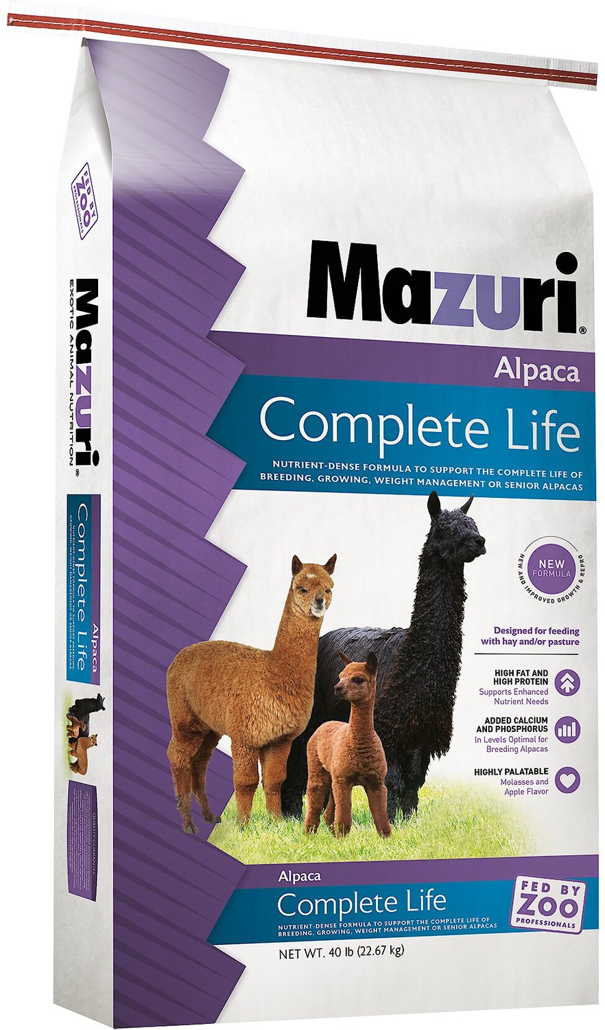 Mazuri Alpaca Growth and Repro Diet was developed with the leading alpaca veterinarian and nutritionist, Dr. Norm Evans. This diet is a coarse-textured sweet feed designed to provide the necessary nutrients for growing, gestating and lactating alpacas.