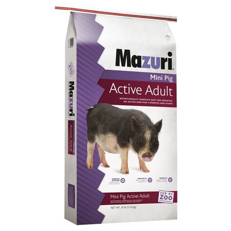Keep mini pigs moving as they grow. Mazuri Mini Pig Active Adult is a moderate-energy, high-fiber food that can be used as a maintenance diet for active adult pigs. You can also feed in combination with Mazuri Mini Pig Youth to support the nutrient needs of gestating or lactating females. Our pellets have a taste your pigs will get excited about at every meal, and complete nutrition you can rely on for their lifetime.