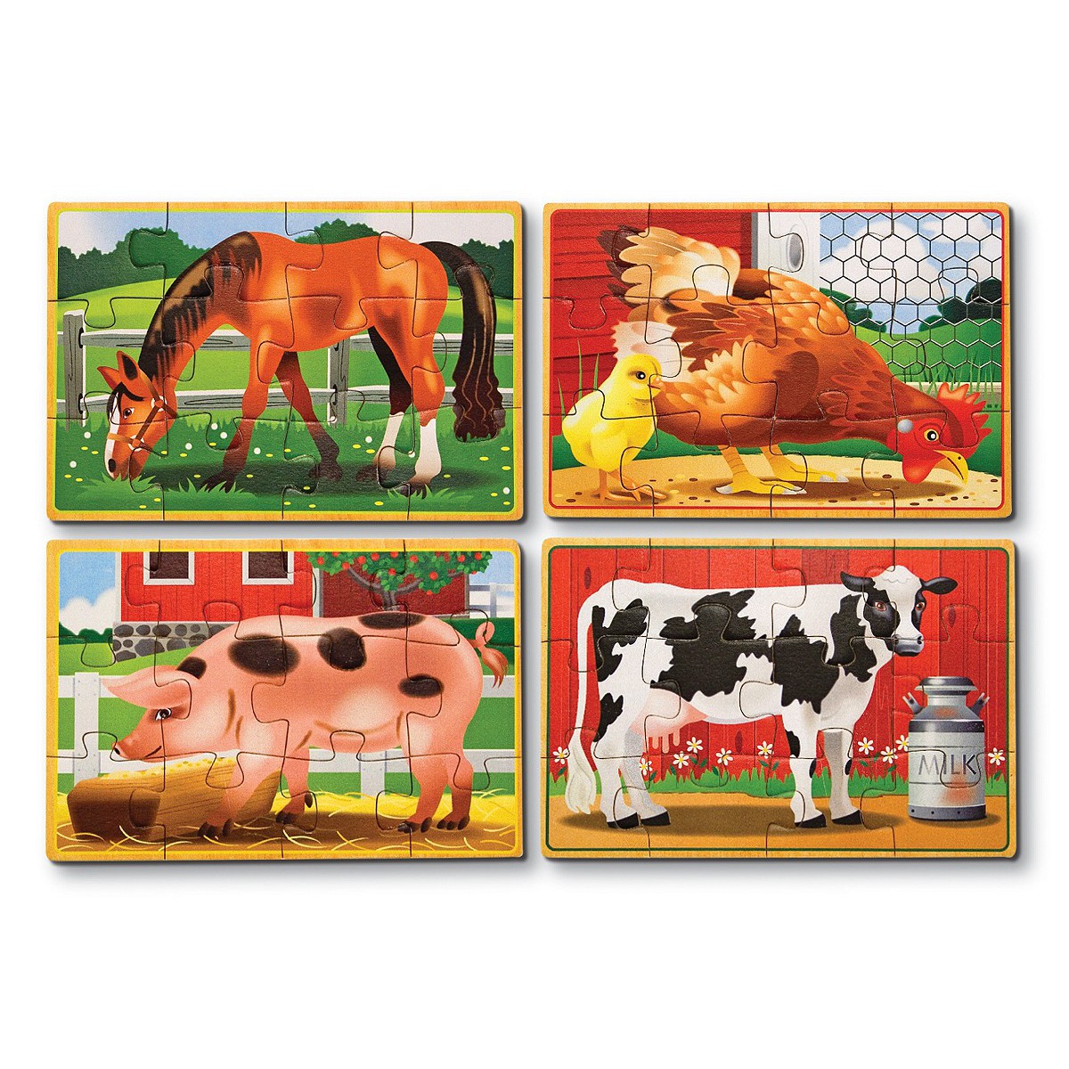 This beautiful wooden jigsaw puzzle set includes four wooden, 12-piece farm animal jigsaw puzzles–a hen and her chick, cow, a pig, and a horse– each stored in a separate compartment of a sturdy wooden box! The slide-on box lid doubles as a convenient puzzle board! Each puzzle piece is shape-coded on the back for easy sorting. Great for travel!