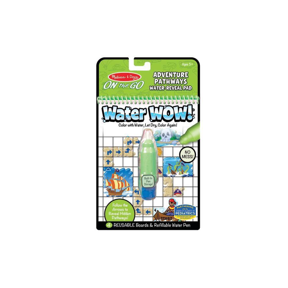 Its no-mess painting for kids! This exciting paint-with-water coloring book includes four reusable pages and a refillable water pen. Follow the arrows to reveal hidden pathways that lead to fun adventures and then fill in the surrounding scenes! Details and vibrant color appear with every stroke. Then let the page dry to erase the pictures and color it in again and again. This adventure-themed book includes four multi-path mazes and scenes to color (space royal kingdom jungle pirates) and search-and-find and counting activities for each scene. The chunky-sized water pen is easy for kids to hold and stores neatly right in the front cover making this Water WOW! an ideal travel activity book and travel toy for kids!