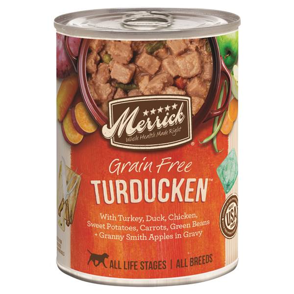Merrick Grain Free Wet Dog Food Turducken’s first ingredient is always real USDA-inspected deboned turkey. This real meat dog food recipe contains duck, and chicken among the first five ingredients. Other natural ingredients, including sweet potatoes, carrots, green beans and granny smith apples, lend wholesome goodness and variety to your dog’s menu. A savory dog food gravy made with turkey and chicken broth adds even more flavor and moisture to daily meals. To meet your dietary preferences, this adult dog food with vegetables contains no artificial colors, flavors, preservatives or by-products. Use this Merrick wet food for dogs as a topper for your dog’s dry kibble, or serve it as a nutritious standalone meal. A convenient pull-tab can makes preparing your dog’s meal quick and easy. Like all Merrick recipes, this Turducken recipe was crafted in our Hereford, TX kitchen and cooked in the USA.