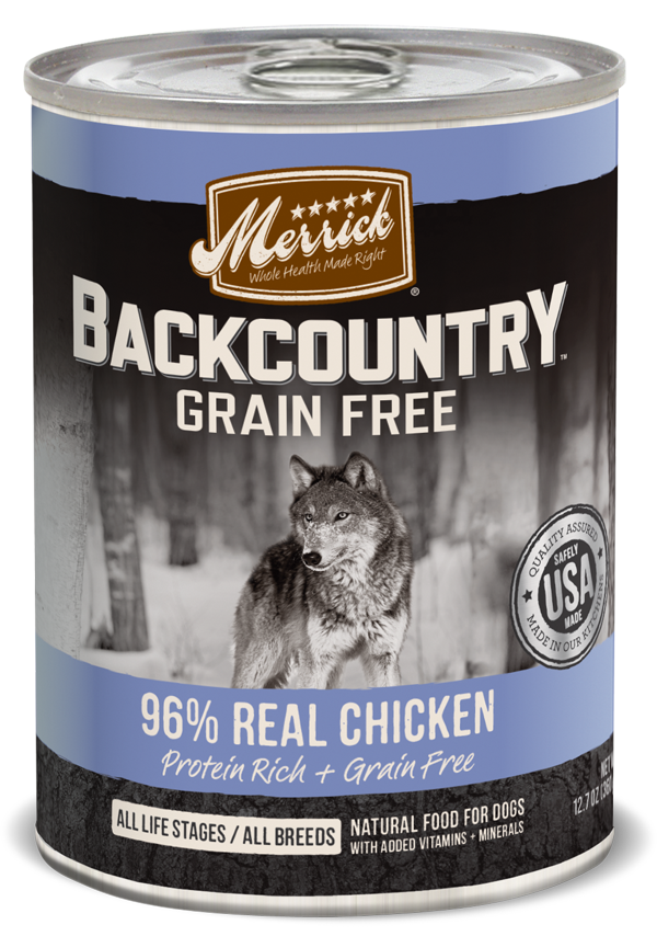 Give your your dog an all natural, ancestral-inspired diet with Merrick Backcountry Grain Free Wet Dog Food Real Chicken Dinner. Made with real deboned chicken to help build and maintain healthy muscle tissue, this adult dog food adds moisture and flavor to your dog’s daily feeding routine. This wet dog food features 96% protein from animal sources, and is pea free and potato free. Serve your dog a protein-rich helping of chicken dog food for a moist entree or mix with kibble for a dual-textured meal. With just the right amount of vitamins and minerals for great nutritional support and crafted without grain, Merrick Backcountry is a natural dog food that supports energy and vitality every day. All Merrick dog food is crafted in our Hereford, TX kitchen and cooked in the USA.