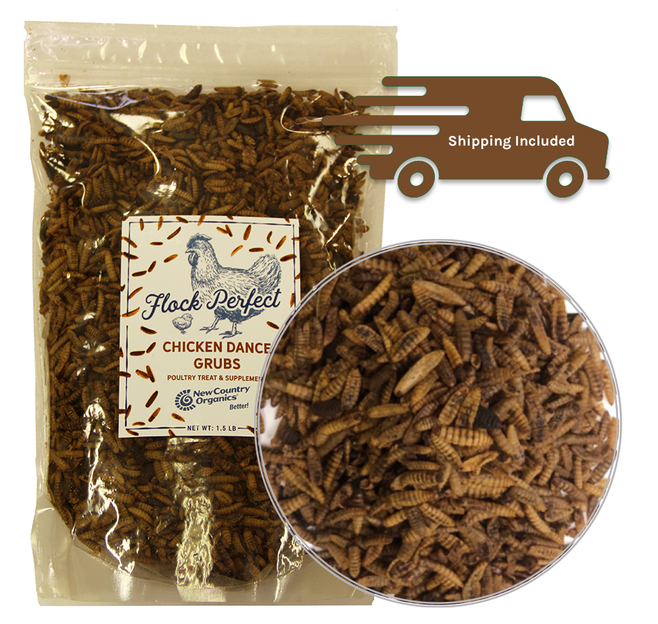 Flock Perfect Chicken Dance Grubs Your flock will break into a chicken dance for these delicious high protein treats! Feed to chicks pullets hens and roos. In addition to keeping your flock happy feeding these grubs will also keep the environment happy as these sustainable grubs are fed on food waste that would otherwise go to landfills. High protein high fat diets are also ideal for hens going through molt as feathers contain upwards of 90% protein. These nutrient dense treats are a great addition to any poultry diet.