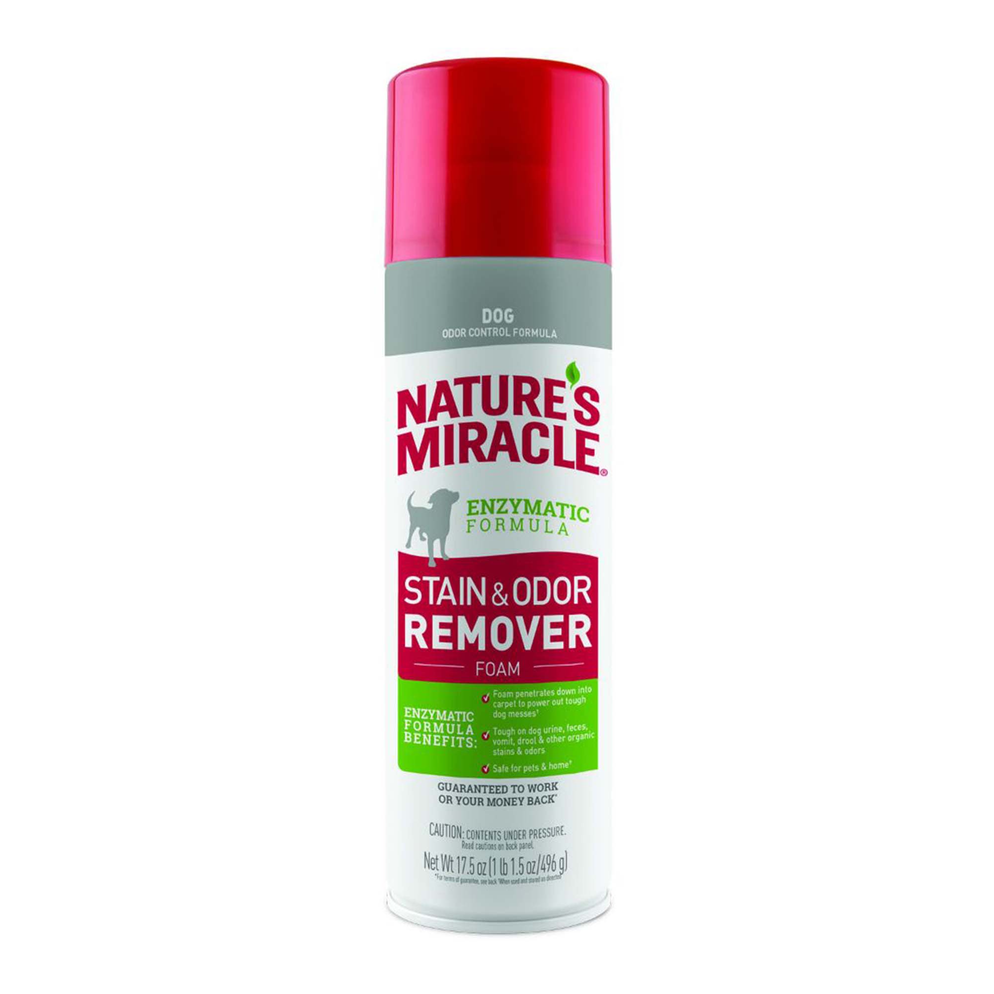 Nature s Miracle Stain & Odor Remover Foam enzymatic formula produces enzymes when it comes into contact with a food source – pet urine feces vomit and other bio-based messes. The enzymatic cleaner will continue working as long as the food source is present. When used and stored as directed the foam penetrates down into carpet to power out tough messes. This spot remover is tough on dog urine feces vomit drool and other organic stains and odors while freshening with a light citrus scent. This product is safe for your pets and home when used and stored as directed.
