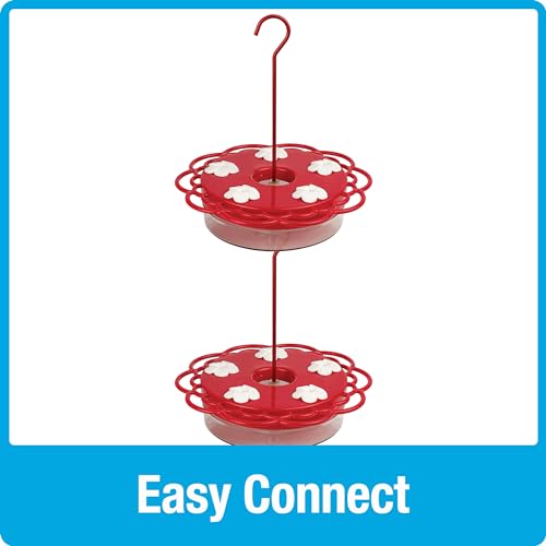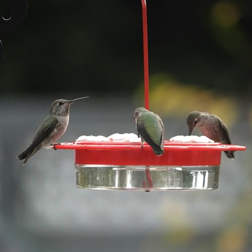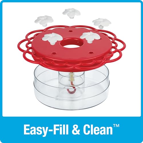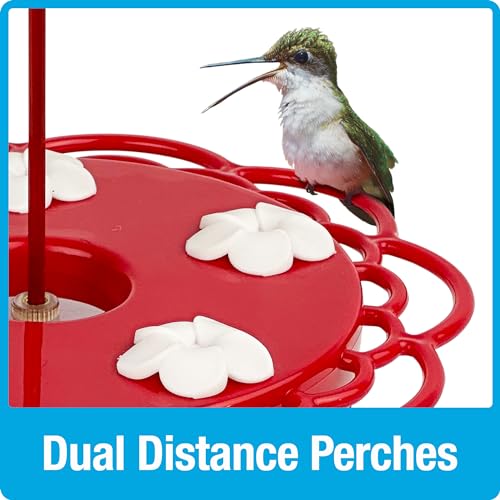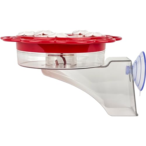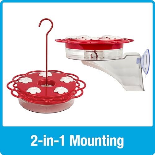 Feed your hummingbirds from the window to the yard with this unique 2-in-1 plastic dish hummingbird feeder! This feeder comes with a hanging hook and window mount, giving you the option to transform it from a traditional hanging hummingbird feeder to a window hummingbird feeder in seconds. Maximize hummingbird comfort and viewing with five flexible lifelike flower ports and dual-distance built-in perches to let the hummingbirds rest while feeding so you can view them longer! This feeder comes equipped with a hanging hook on the bottom, allowing you to connect multiple feeders together to feed even more hummingbirds in one space. Defend your nectar and protect your hummingbirds with the built-in ant moat which stops ants before they can reach the nectar. The domed flower ports create a naturally bee-resistant design while sufficient distance from the feeding ports to the bottom of the base dish ensures hummingbirds of all sizes can reach the nectar with their long tongues. Never worry about trapped dirt or grime since the two-part base system and removable flower ports allow the feeder to be completely disassembled for a thorough cleaning. The clear base dish holds up to 13 oz of nectar.