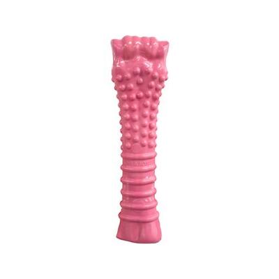 Our pink Power Chew toy provides a way for you and your furry family member to show support for breast cancer awareness. For every one of these custom-made Nylabone Souper chew toys you purchase we will donate $1 to National Breast Cancer Foundation Inc. This honorable organization inspires hope to those affected by breast cancer through early detection education and support services. In addition to helping raise awareness for this honorable cause our long lasting dog chew toy will help your furry friend learn healthy non-destructive chewing habits. This nylon chew toy stands up to power chewers and offers ongoing entertainment to satisfy their natural urge to chew. It features savory chicken flavor throughout and a unique textured surface offering your dog even more chewing fun! Plus this bone chew toy includes nubs and ridges that promote clean teeth and help control plaque and tartar as your dog chews. Our extra large dog chew toy is recommended for dogs over 50 pounds!