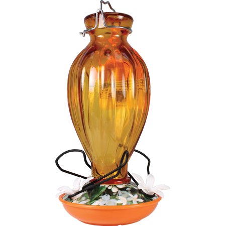 Audubon s fluted glass oriole feeder is perfect for any lawn or garden! Bring a vibrant flare of color to your yard with the delightful orange glass. Your orioles will love the 3 white floral ports and the flower printed base. This oriole feeder has an amazing 20 OZ capacity perfect for feeding your orioles. Specifications Width: 4.5 in. Height: 10 in. Deep: 4.5 in. Nectar Capacity: 20 oz Ports: 4 Construction: Glass Origin Country: China.